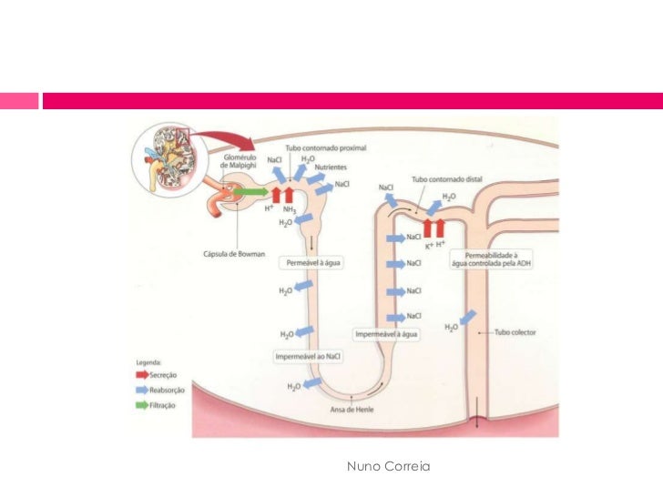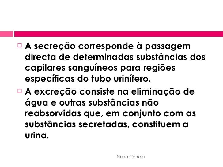 9. 9. <ul><li>A secreção corresponde à passagem directa de determinadas substâncias dos capilares sanguíneos para regiões específicas do tubo urinífero. </li></ul><ul><li>A excreção consiste na eliminação de água e outras substâncias não reabsorvidas que, em conjunto com as substâncias secretadas, constituem a urina. </li></ul>Nuno Correia
