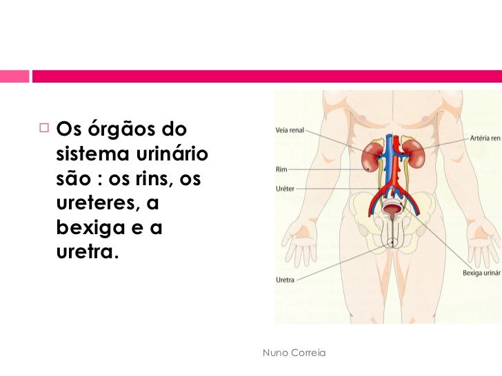 3. 3. <ul><li>Os órgãos do sistema urinário são : os rins, os ureteres, a bexiga e a uretra. </li></ul>Nuno Correia