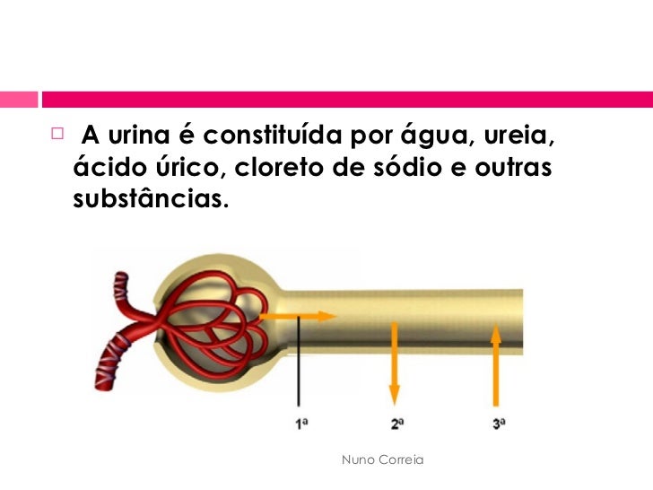 4. 4. <ul><li>  A urina é constituída por água, ureia, ácido úrico, cloreto de sódio e outras substâncias. </li></ul>Nuno Correia