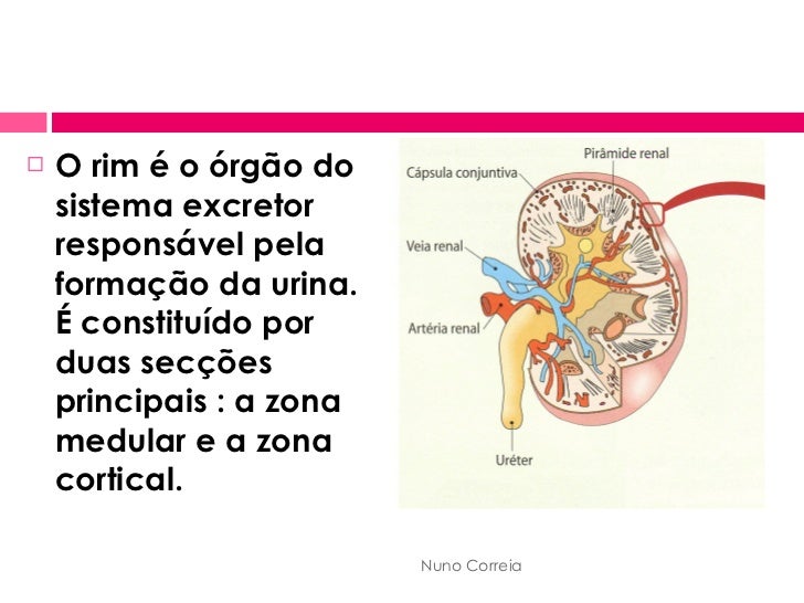 5. 5. <ul><li>O rim é o órgão do sistema excretor responsável pela formação da urina. É constituído por duas secções principais : a zona medular e a zona cortical. </li></ul>Nuno Correia