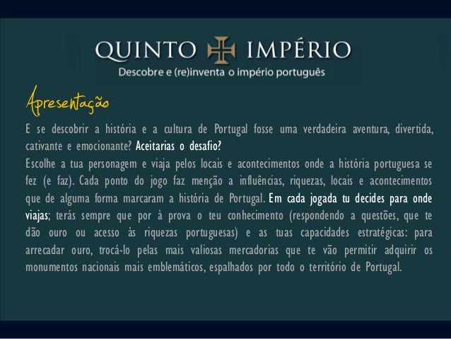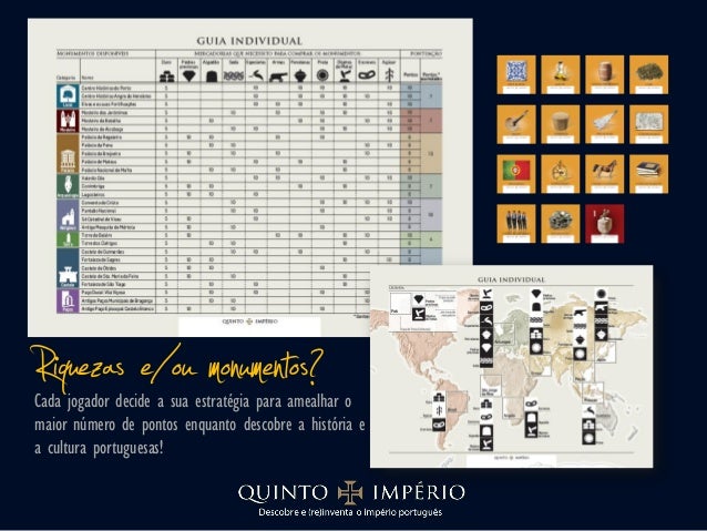 Cada jogador encarna uma personagem icónica da nossa cultura e parte numa viagem pelos locais por onde os portugueses andaram, por todo o mundo, até aos nossos dias. Nesta viagem, cada jogador vai por à prova o seu conhecimento sobre a história, geografia e cultura portuguesas e negociar diferentes mercadorias, a Oriente e Ocidente, para no final adquirir alguns dos 28 monumentos nacionais ilustrados no jogo.