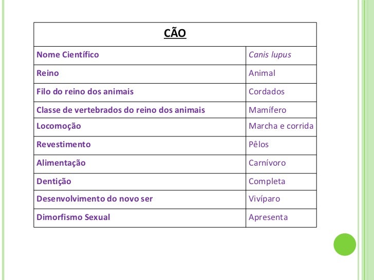 10. 18. CÃO Nome Científico Canis lupus Reino Animal Filo do reino dos animais Cordados Classe de vertebrados do reino dos animais Mamífero Locomoção Marcha e corrida Revestimento Pêlos Alimentação Carnívoro Dentição Completa Desenvolvimento do novo ser Vivíparo Dimorfismo Sexual Apresenta