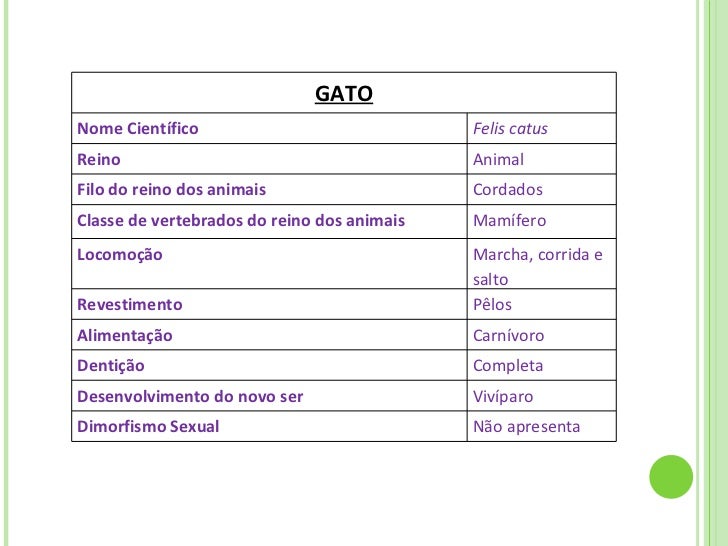 11. 19. GATO Nome Científico Felis catus Reino Animal Filo do reino dos animais Cordados Classe de vertebrados do reino dos animais Mamífero Locomoção Marcha, corrida e salto Revestimento Pêlos Alimentação Carnívoro Dentição Completa Desenvolvimento do novo ser Vivíparo Dimorfismo Sexual Não apresenta