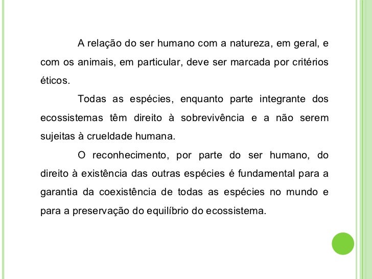 2. 2. A relação do ser humano com a natureza, em geral, e com os animais, em particular, deve ser marcada por critérios éticos. Todas as espécies, enquanto parte integrante dos ecossistemas têm direito à sobrevivência e a não serem sujeitas à crueldade humana. O reconhecimento, por parte do ser humano, do direito à existência das outras espécies é fundamental para a garantia da coexistência de todas as espécies no mundo e para a preservação do equilíbrio do ecossistema.