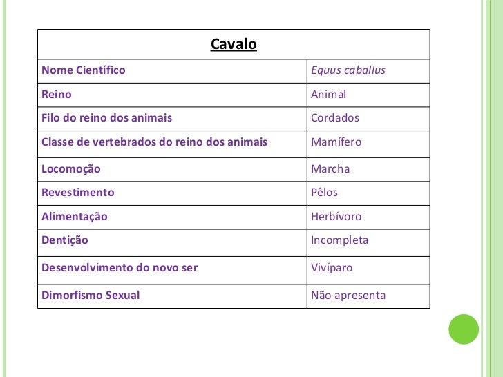 13. 21. Cavalo Nome Científico Equus caballus Reino Animal Filo do reino dos animais Cordados Classe de vertebrados do reino dos animais Mamífero Locomoção Marcha Revestimento Pêlos Alimentação Herbívoro Dentição Incompleta Desenvolvimento do novo ser Vivíparo Dimorfismo Sexual Não apresenta