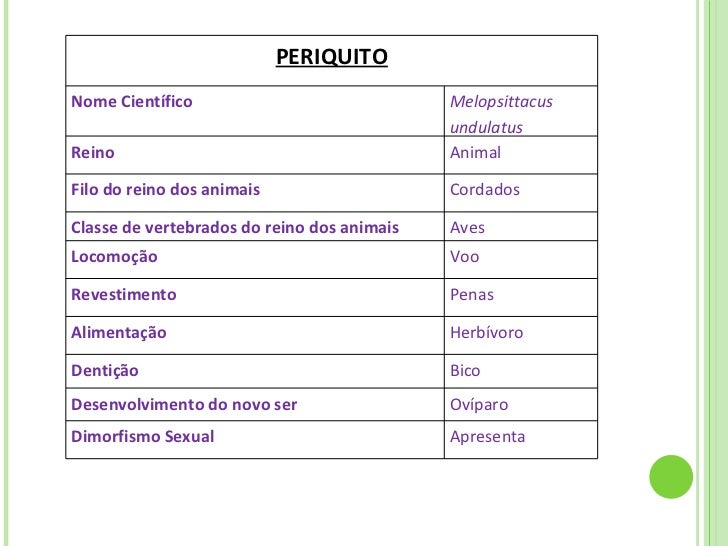 15. 23. PERIQUITO Nome Científico Melopsittacus undulatus Reino Animal Filo do reino dos animais Cordados Classe de vertebrados do reino dos animais Aves Locomoção Voo Revestimento Penas Alimentação Herbívoro Dentição Bico Desenvolvimento do novo ser Ovíparo Dimorfismo Sexual Apresenta
