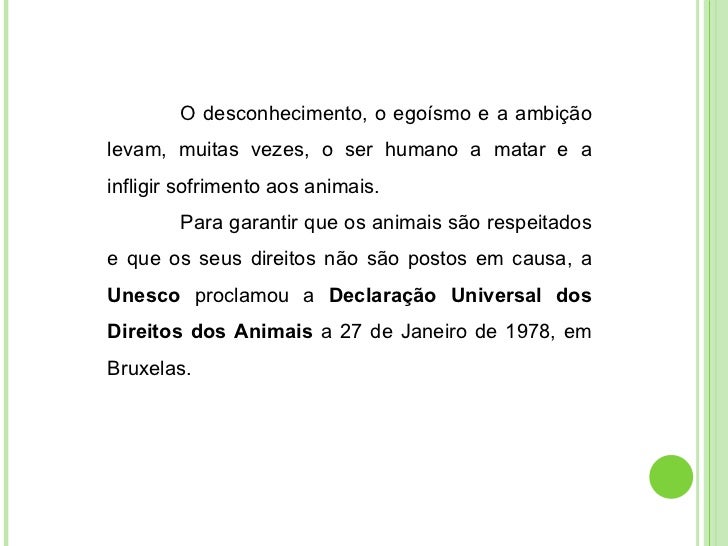 3. 3. O desconhecimento, o egoísmo e a ambição levam, muitas vezes, o ser humano a matar e a infligir sofrimento aos animais. Para garantir que os animais são respeitados e que os seus direitos não são postos em causa, a Unesco proclamou a Declaração Universal dos Direitos dos Animais a 27 de Janeiro de 1978, em Bruxelas.
