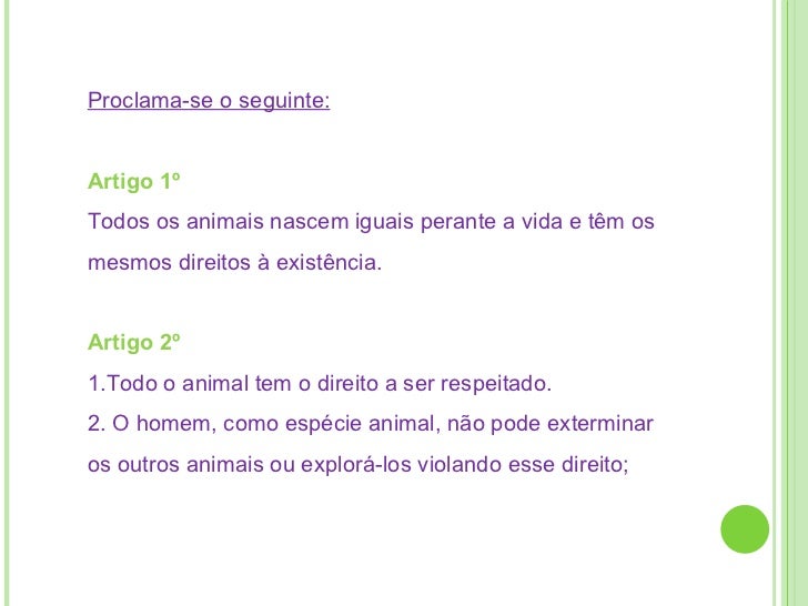 4. 5. Proclama-se o seguinte: Artigo 1º Todos os animais nascem iguais perante a vida e têm os mesmos direitos à existência. Artigo 2º 1.Todo o animal tem o direito a ser respeitado. 2. O homem, como espécie animal, não pode exterminar os outros animais ou explorá-los violando esse direito;