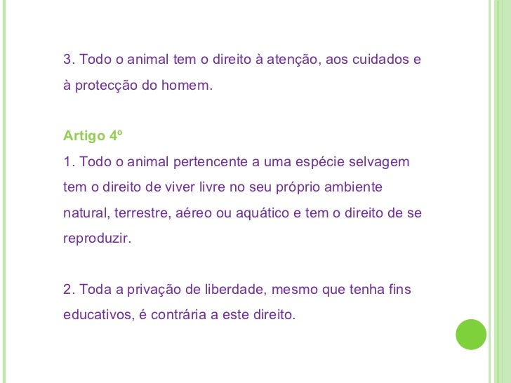 5. 6. 3. Todo o animal tem o direito à atenção, aos cuidados e à protecção do homem. Artigo 4º 1. Todo o animal pertencente a uma espécie selvagem tem o direito de viver livre no seu próprio ambiente natural, terrestre, aéreo ou aquático e tem o direito de se reproduzir. 2. Toda a privação de liberdade, mesmo que tenha fins educativos, é contrária a este direito.
