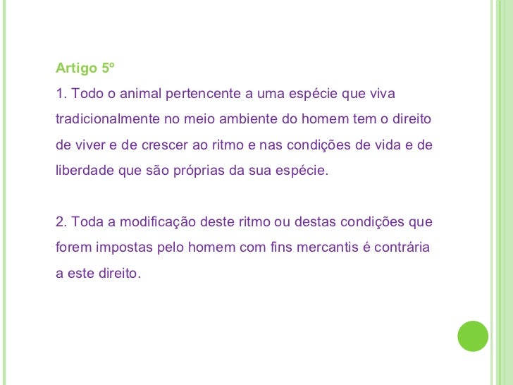 6. 7. Artigo 5º 1. Todo o animal pertencente a uma espécie que viva tradicionalmente no meio ambiente do homem tem o direito de viver e de crescer ao ritmo e nas condições de vida e de liberdade que são próprias da sua espécie. 2. Toda a modificação deste ritmo ou destas condições que forem impostas pelo homem com fins mercantis é contrária a este direito.
