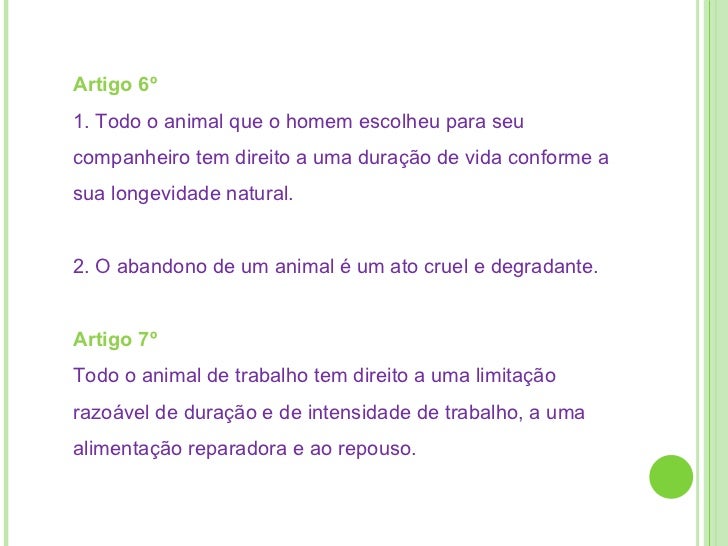 7. 8. Artigo 6º 1. Todo o animal que o homem escolheu para seu companheiro tem direito a uma duração de vida conforme a sua longevidade natural. 2. O abandono de um animal é um ato cruel e degradante. Artigo 7º Todo o animal de trabalho tem direito a uma limitação razoável de duração e de intensidade de trabalho, a uma alimentação reparadora e ao repouso.