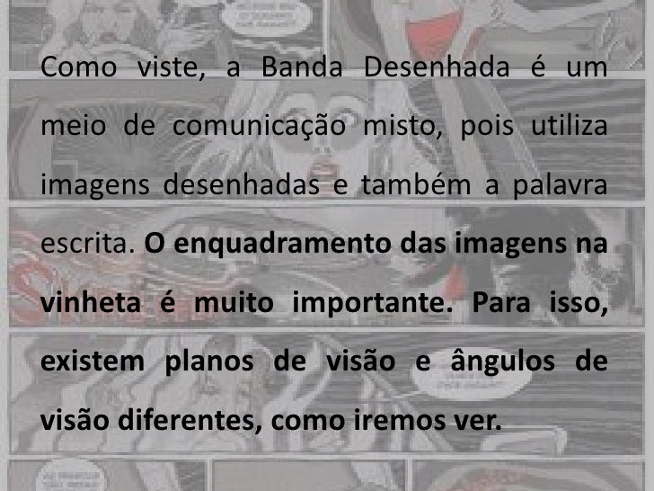 9. 9. Como viste, a Banda Desenhada é ummeio de comunicação misto, pois utilizaimagens desenhadas e também a palavraescrita. O enquadramento das imagens navinheta é muito importante. Para isso,existem planos de visão e ângulos devisão diferentes, como iremos ver.