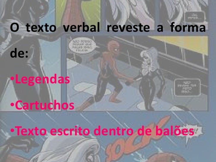 O texto verbal reveste a formade:•Legendas•Cartuchos•Texto escrito dentro de balões