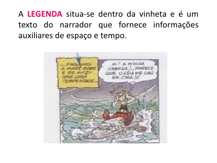 5. 5. A LEGENDA situa-se dentro da vinheta e é umtexto do narrador que fornece informaçõesauxiliares de espaço e tempo.