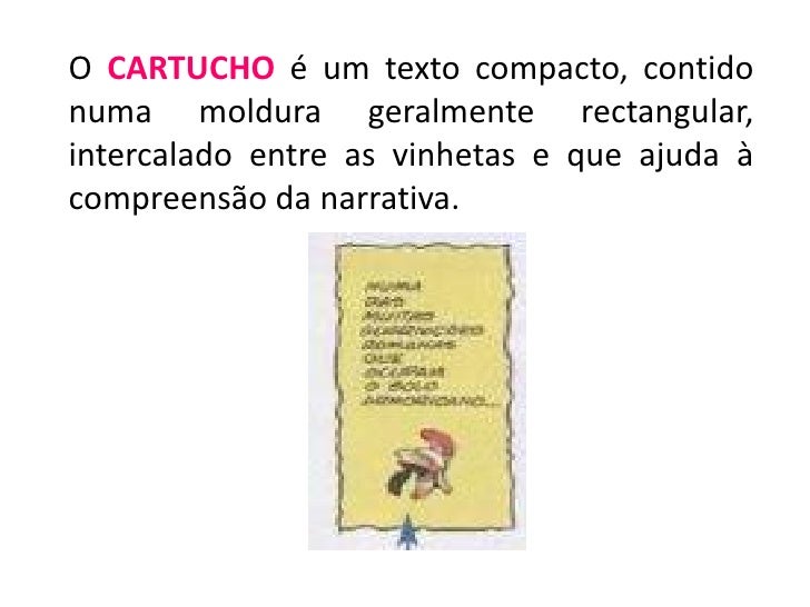 6. 6. O CARTUCHO é um texto compacto, contidonuma moldura geralmente rectangular,intercalado entre as vinhetas e que ajuda àcompreensão da narrativa.