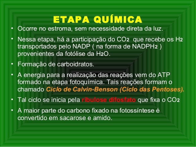 11. 11. ETAPA QUÍMICA  Ocorre no estroma, sem necessidade direta da luz.  Nessa etapa, há a participação do CO2 que recebe os H2 transportados pelo NADP ( na forma de NADPH2 ) provenientes da fotólise da H2O.  Formação de carboidratos.  A energia para a realização das reações vem do ATP formado na etapa fotoquímica. Tais reações formam o chamado Ciclo de Calvin-Benson (Ciclo das Pentoses).  Tal ciclo se inicia pela ribulose difosfato que fixa o CO2  A maior parte do carbono fixado na fotossíntese é convertido em sacarose e amido.