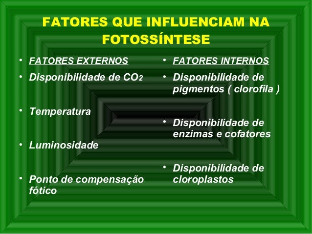 12. 12. FATORES QUE INFLUENCIAM NA FOTOSSÍNTESE  FATORES EXTERNOS  Disponibilidade de CO2  Temperatura  Luminosidade  Ponto de compensação fótico  FATORES INTERNOS  Disponibilidade de pigmentos ( clorofila )  Disponibilidade de enzimas e cofatores  Disponibilidade de cloroplastos