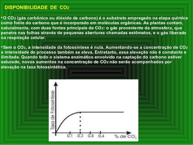 13. 13. DISPONIBILIDADE DE CO2  O CO2 (gás carbônico ou dióxido de carbono) é o substrato empregado na etapa química como fonte do carbono que é incorporado em moléculas orgânicas. As plantas contam, naturalmente, com duas fontes principais de CO2: o gás proveniente da atmosfera, que penetra nas folhas através de pequenas aberturas chamadas estômatos, e o gás liberado na respiração celular.  Sem o CO2, a intensidade da fotossíntese é nula. Aumentando-se a concentração de CO2 a intensidade do processo também se eleva. Entretanto, essa elevação não é constante e ilimitada. Quando todo o sistema enzimático envolvido na captação do carbono estiver saturado, novos aumentos na concentração de CO2 não serão acompanhados por elevação na taxa fotossintética.