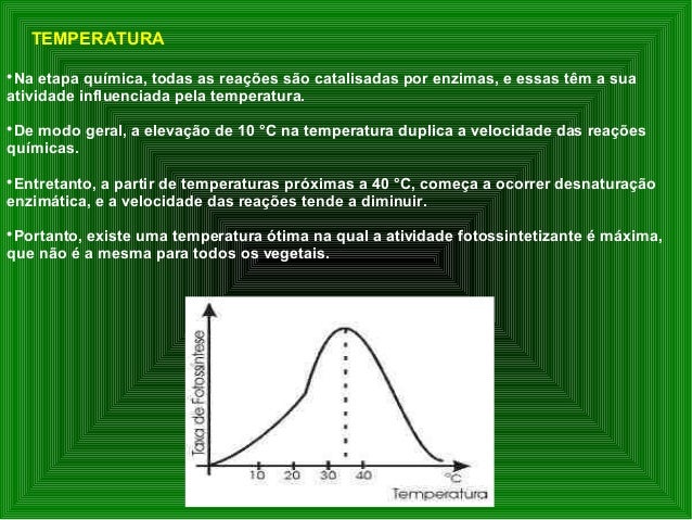 14. 14.  Na etapa química, todas as reações são catalisadas por enzimas, e essas têm a sua atividade influenciada pela temperatura.  De modo geral, a elevação de 10 °C na temperatura duplica a velocidade das reações químicas.  Entretanto, a partir de temperaturas próximas a 40 °C, começa a ocorrer desnaturação enzimática, e a velocidade das reações tende a diminuir.  Portanto, existe uma temperatura ótima na qual a atividade fotossintetizante é máxima, que não é a mesma para todos os vegetais. TEMPERATURA