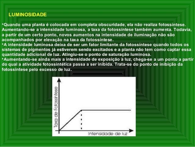 15. 15.  Quando uma planta é colocada em completa obscuridade, ela não realiza fotossíntese. Aumentando-se a intensidade luminosa, a taxa da fotossíntese também aumenta. Todavia, a partir de um certo ponto, novos aumentos na intensidade de iluminação não são acompanhados por elevação na taxa da fotossíntese.  A intensidade luminosa deixa de ser um fator limitante da fotossíntese quando todos os sistemas de pigmentos já estiverem sendo excitados e a planta não tem como captar essa quantidade adicional de luz. Atingiu-se o ponto de saturação luminosa.  Aumentando-se ainda mais a intensidade de exposição à luz, chega-se a um ponto a partir do qual a atividade fotossintética passa a ser inibida. Trata-se do ponto de inibição da fotossíntese pelo excesso de luz. LUMINOSIDADE