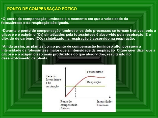 16. 16.  O ponto de compensação luminoso é o momento em que a velocidade da fotossíntese e da respiração são iguais.  Durante o ponto de compensação luminoso, os dois processos se tornam inativos, pois a glicose e o oxigênio (O2) sintetizados pela fotossíntese é absorvido pela respiração. E o dióxido de carbono (CO2) sintetizado na respiração é absorvido na respiração.  Ainda assim, as plantas com o ponto de compensação luminoso alto, possuem a intensidade da fotossíntese maior que a intensidade da respiração. O que quer dizer que a glicose e o oxigênio são mais produzidos do que absorvidos, resultando no desenvolvimento da planta. PONTO DE COMPENSAÇÃO FÓTICO