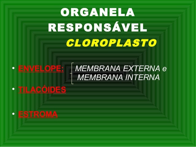 2. 2. ORGANELA RESPONSÁVEL CLOROPLASTO  ENVELOPE: MEMBRANA EXTERNA e MEMBRANA INTERNA  TILACÓIDES  ESTROMA