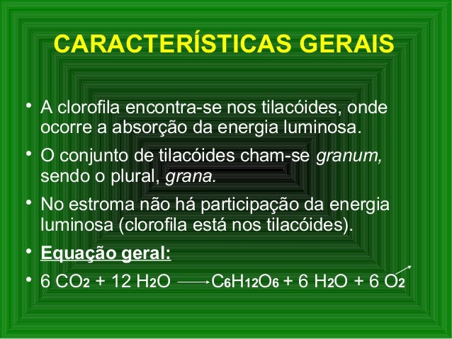 4. 4. CARACTERÍSTICAS GERAIS  A clorofila encontra-se nos tilacóides, onde ocorre a absorção da energia luminosa.  O conjunto de tilacóides cham-se granum, sendo o plural, grana.  No estroma não há participação da energia luminosa (clorofila está nos tilacóides).  Equação geral:  6 CO2 + 12 H2O C6H12O6 + 6 H2O + 6 O2