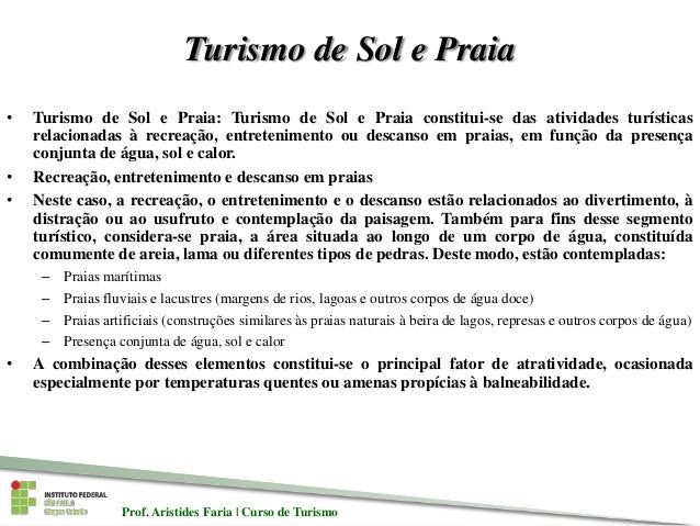 3. 3. Prof. Aristides Faria | Curso de TurismoProf. Aristides Faria | Curso de Turismo Turismo de Sol e Praia • Turismo de Sol e Praia: Turismo de Sol e Praia constitui-se das atividades turísticas relacionadas à recreação, entretenimento ou descanso em praias, em função da presença conjunta de água, sol e calor. • Recreação, entretenimento e descanso em praias • Neste caso, a recreação, o entretenimento e o descanso estão relacionados ao divertimento, à distração ou ao usufruto e contemplação da paisagem. Também para fins desse segmento turístico, considera-se praia, a área situada ao longo de um corpo de água, constituída comumente de areia, lama ou diferentes tipos de pedras. Deste modo, estão contempladas: – Praias marítimas – Praias fluviais e lacustres (margens de rios, lagoas e outros corpos de água doce) – Praias artificiais (construções similares às praias naturais à beira de lagos, represas e outros corpos de água) – Presença conjunta de água, sol e calor • A combinação desses elementos constitui-se o principal fator de atratividade, ocasionada especialmente por temperaturas quentes ou amenas propícias à balneabilidade.
