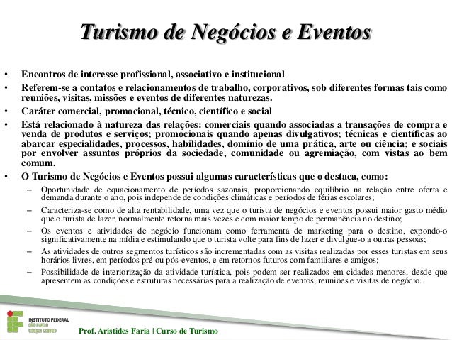5. 5. Prof. Aristides Faria | Curso de TurismoProf. Aristides Faria | Curso de Turismo Turismo de Negócios e Eventos • Encontros de interesse profissional, associativo e institucional • Referem-se a contatos e relacionamentos de trabalho, corporativos, sob diferentes formas tais como reuniões, visitas, missões e eventos de diferentes naturezas. • Caráter comercial, promocional, técnico, científico e social • Está relacionado à natureza das relações: comerciais quando associadas a transações de compra e venda de produtos e serviços; promocionais quando apenas divulgativos; técnicas e científicas ao abarcar especialidades, processos, habilidades, domínio de uma prática, arte ou ciência; e sociais por envolver assuntos próprios da sociedade, comunidade ou agremiação, com vistas ao bem comum. • O Turismo de Negócios e Eventos possui algumas características que o destaca, como: – Oportunidade de equacionamento de períodos sazonais, proporcionando equilíbrio na relação entre oferta e demanda durante o ano, pois independe de condições climáticas e períodos de férias escolares; – Caracteriza-se como de alta rentabilidade, uma vez que o turista de negócios e eventos possui maior gasto médio que o turista de lazer, normalmente retorna mais vezes e com maior tempo de permanência no destino; – Os eventos e atividades de negócio funcionam como ferramenta de marketing para o destino, expondo-o significativamente na mídia e estimulando que o turista volte para fins de lazer e divulgue-o a outras pessoas; – As atividades de outros segmentos turísticos são incrementadas com as visitas realizadas por esses turistas em seus horários livres, em períodos pré ou pós-eventos, e em retornos futuros com familiares e amigos; – Possibilidade de interiorização da atividade turística, pois podem ser realizados em cidades menores, desde que apresentem as condições e estruturas necessárias para a realização de eventos, reuniões e visitas de negócio.