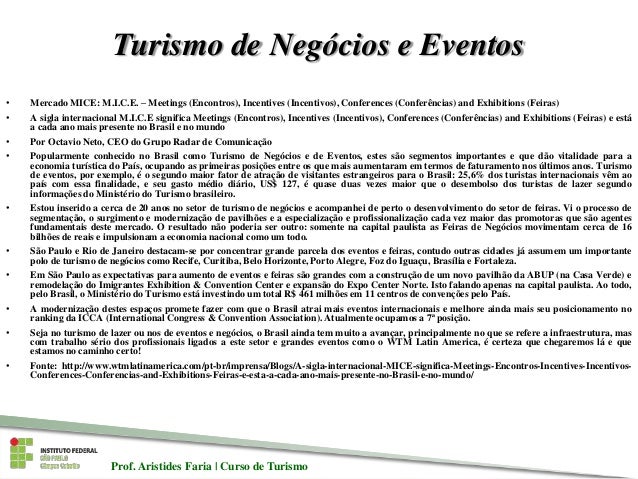 4. 4. Prof. Aristides Faria | Curso de TurismoProf. Aristides Faria | Curso de Turismo Turismo de Negócios e Eventos • Turismo de Negócios e Eventos: Turismo de Negócios e Eventos compreende o conjunto de atividades turísticas decorrentes dos encontros de interesse profissional, associativo, institucional, de caráter comercial, promocional, técnico, científico e social. • A globalização, a formação de blocos econômicos, a aceleração da economia mundial e o crescimento das multinacionais são alguns dos fatores que configuraram um movimento internacional sem precedentes para a efetivação de transações e relacionamentos de caráter comercial, e a realização de eventos com finalidades e interesses diversos. • O Brasil vem se posicionando como um destino de negócios, com destaque para as áreas de telecomunicações, biotecnologia, finanças, moda, entre outras. No que se refere à realização de eventos, a profissionalização do setor e as opções de lazer relacionadas à diversidade dos recursos naturais e culturais são alguns dos fatores para o crescimento do segmento. • Os eventos, por sua vez, compreendem encontros programados e organizados como congressos, convenções, simpósios, lançamentos, mostras, exposições e feiras.