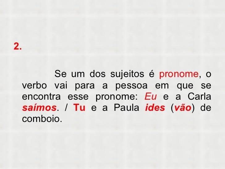 10. 10. <ul><li>2. </li></ul><ul><li>Se um dos sujeitos é pronome , o verbo vai para a pessoa em que se encontra esse pronome: Eu e a Carla saímos . / Tu e a Paula ides ( vão ) de comboio. </li></ul>