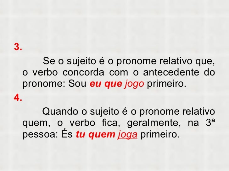 11. 11. <ul><li>3. </li></ul><ul><li>Se o sujeito é o pronome relativo que, o verbo concorda com o antecedente do pronome: Sou eu que jogo primeiro. </li></ul><ul><li>4. </li></ul><ul><li>Quando o sujeito é o pronome relativo quem, o verbo fica, geralmente, na 3ª pessoa: És tu quem joga primeiro. </li></ul>