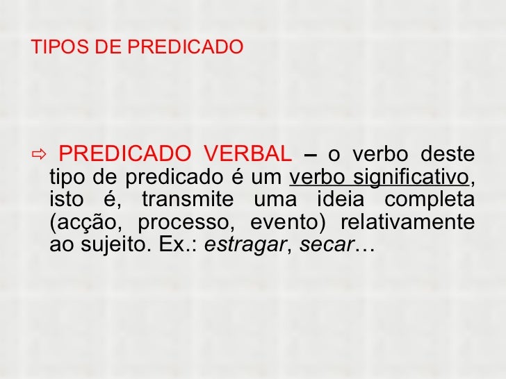 13. 13. TIPOS DE PREDICADO <ul><li> PREDICADO VERBAL – o verbo deste tipo de predicado é um verbo significativo , isto é, transmite uma ideia completa (acção, processo, evento) relativamente ao sujeito. Ex.: estragar , secar … </li></ul>