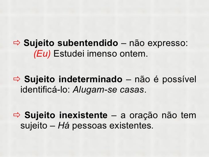 5. 5. <ul><li> Sujeito subentendido – não expresso: (Eu) Estudei imenso ontem. </li></ul><ul><li> Sujeito indeterminado – não é possível identificá-lo: Alugam-se casas . </li></ul><ul><li> Sujeito inexistente – a oração não tem sujeito – Há pessoas existentes . </li></ul>
