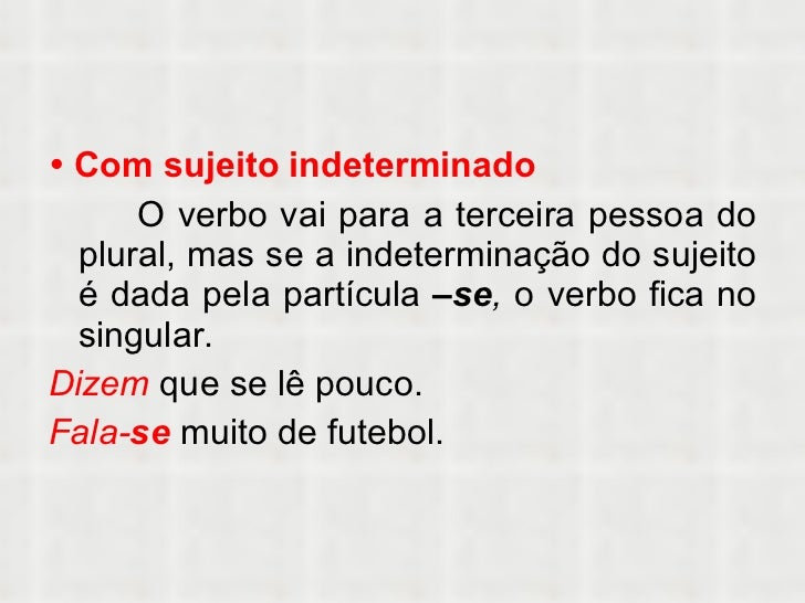 7. 7. <ul><li> Com sujeito indeterminado </li></ul><ul><li>O verbo vai para a terceira pessoa do plural, mas se a indeterminação do sujeito é dada pela partícula –se , o verbo fica no singular. </li></ul><ul><li>Dizem que se lê pouco. </li></ul><ul><li>Fala- se muito de futebol. </li></ul>