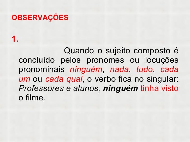 9. 9. OBSERVAÇÕES <ul><li>1. </li></ul><ul><li>Quando o sujeito composto é concluído pelos pronomes ou locuções pronominais ninguém , nada , tudo , cada um ou cada qual , o verbo fica no singular: Professores e alunos, ninguém tinha visto o filme. </li></ul>