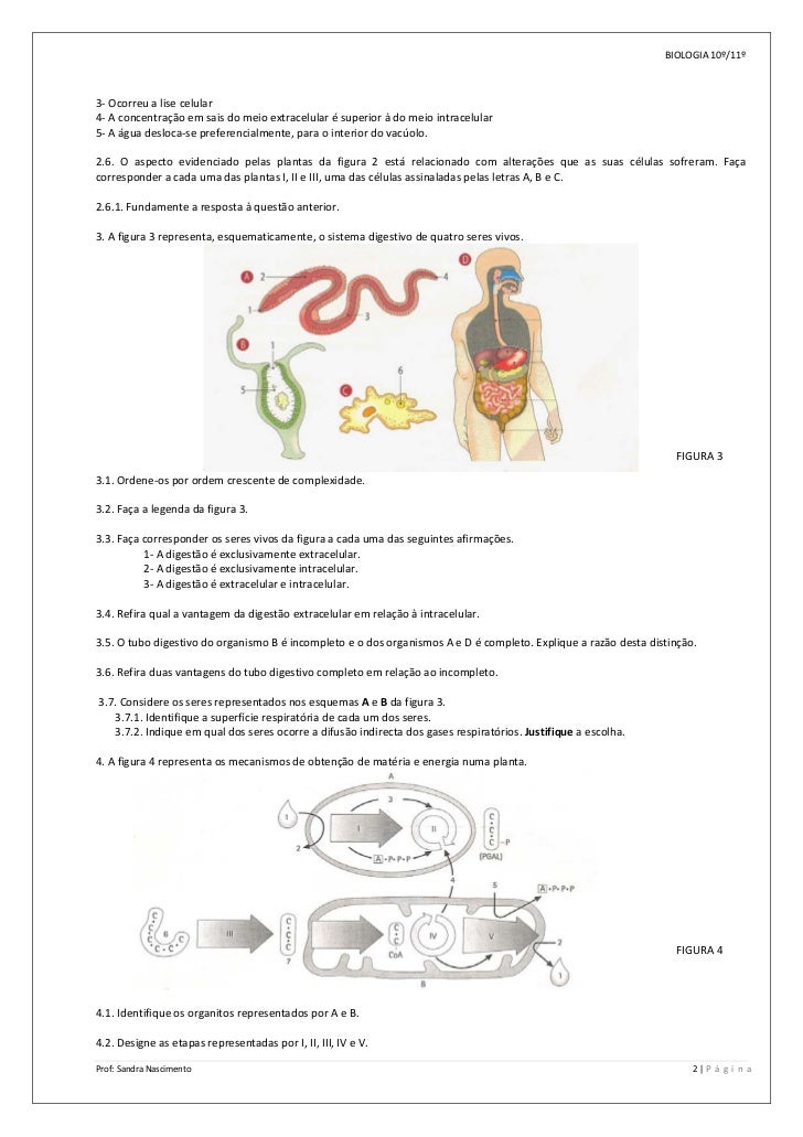 2. 2. BIOLOGIA 10º/11º  3‐ Ocorreu a lise celular  4‐ A concentração em sais do meio extracelular é superior à do meio intracelular  5‐ A água desloca‐se preferencialmente, para o interior do vacúolo.    2.6.  O  aspecto  evidenciado  pelas  plantas  da  figura  2  está  relacionado  com  alterações  que  as  suas  células  sofreram.  Faça  corresponder a cada uma das plantas I, II e III, uma das células assinaladas pelas letras A, B e C.    2.6.1. Fundamente a resposta à questão anterior.    3. A figura 3 representa, esquematicamente, o sistema digestivo de quatro seres vivos.   FIGURA 3    3.1. Ordene‐os por ordem crescente de complexidade.    3.2. Faça a legenda da figura 3.    3.3. Faça corresponder os seres vivos da figura a cada uma das seguintes afirmações.      1‐ A digestão é exclusivamente extracelular.  2‐ A digestão é exclusivamente intracelular.  3‐ A digestão é extracelular e intracelular.    3.4. Refira qual a vantagem da digestão extracelular em relação à intracelular.    3.5. O tubo digestivo do organismo B é incompleto e o dos organismos A e D é completo. Explique a razão desta distinção.    3.6. Refira duas vantagens do tubo digestivo completo em relação ao incompleto.     3.7. Considere os seres representados nos esquemas A e B da figura 3.          3.7.1. Identifique a superfície respiratória de cada um dos seres.         3.7.2. Indique em qual dos seres ocorre a difusão indirecta dos gases respiratórios. Justifique a escolha.                    4. A figura 4 representa os mecanismos de obtenção de matéria e energia numa planta.                            FIGURA 4       4.1. Identifique os organitos representados por A e B.    4.2. Designe as etapas representadas por I, II, III, IV e V.  Prof: Sandra Nascimento    2 | P á g i n a