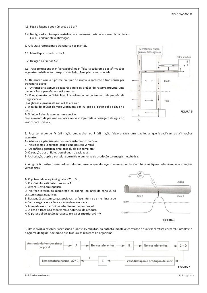 3. 3. BIOLOGIA 10º/11º  4.3. Faça a legenda dos números de 1 a 7.    4.4. Na figura 4 estão representados dois processos metabólicos complementares.         4.4.1. Fundamente a afirmação.    5. A figura 5 representa o transporte nas plantas.    5.1. Identifique os tecidos 1 e 2.    5.2. Designe os fluidos A e B.     5.3. Faça corresponder V (verdadeira) ou F (falsa) a cada uma das afirmações  seguintes, relativas ao transporte do fluido B na planta considerada.    A ‐ De acordo com a hipótese do fluxo de massa, a sacarose é transferida por  transporte activo.  B  ‐  O  transporte  activo  da  sacarose  para  os  órgãos  de  reserva  provoca  uma  diminuição da pressão osmótica nestes.  C ‐ O movimento do fluido B está relacionado com o aumento da pressão de  turgescência.  D‐ A glicose é produzida nas células da raiz.  E‐ A saída do açúcar do vaso 2 provoca diminuição do  potencial de água no  vaso 1.  FIGURA 5  F‐ O fluido B circula apenas num sentido.  G‐ o aumento da pressão osmótica no vaso 2 permite a passagem de água do  vaso 1 para o vaso 2.      6.  Faça  corresponder  V  (afirmação  verdadeira)  ou  F  (afirmação  falsa)  a  cada  uma  das  letras  que  identificam  as  afirmações  seguintes:  A ‐ A hidra e a planária não possuem sistema circulatório.  B ‐ Nos insectos, o coração ocupa uma posição ventral.  C ‐ Os anfíbios possuem circulação dupla e incompleta.  D‐ O coração dos anfíbios possui quatro cavidades.  E‐ A circulação dupla e completa permitiu o aumento da produção da energia metabólica.     7. A figura 6 mostra o resultado obtido num axónio quando sujeito a um estímulo. Com base na figura, seleccione as afirmações  verdadeiras.      A‐ O potencial de acção é igual a  ‐75  mV.  B‐ O axónio foi estimulado na zona A.  C‐ A zona 1 está em repouso.  D‐  Na  face  interna  da  membrana  do  axónio,  ao  nível  da  zona  A,  só  existem cargas negativas.  E‐ Na zona 2 existem cargas positivas na face interna da membrana do  axónio e negativas na face externa da membrana.  F‐ A membrana do axónio é selectivamente permeável.  G‐ A linha a tracejado representa o potencial de repouso.  H‐ O potencial de acção apresenta um valor superior a 0 mV      FIGURA 6   8. Um indivíduo resolveu fazer sauna durante 15 minutos, no entanto, manteve constante a sua temperatura corporal. Complete o  diagrama da figura 7 de modo que traduza as reacções do organismo.                     FIGURA 7    Prof: Sandra Nascimento    3 | P á g i n a