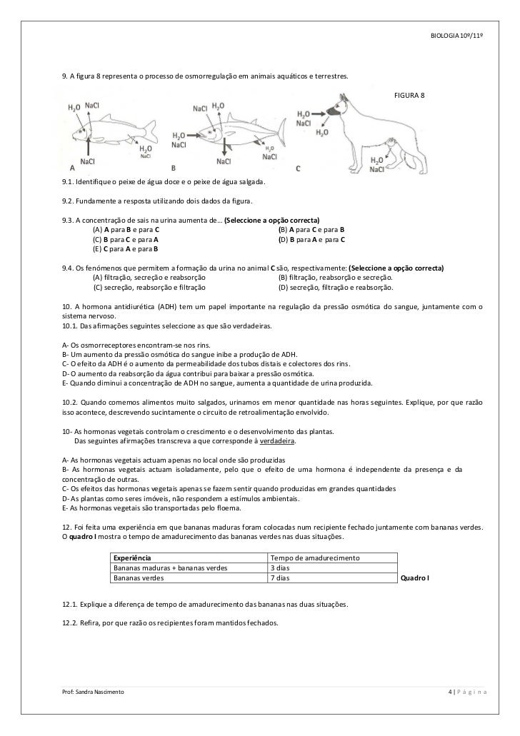4. 4. BIOLOGIA 10º/11º    9. A figura 8 representa o processo de osmorregulação em animais aquáticos e terrestres.      FIGURA 8                  9.1. Identifique o peixe de água doce e o peixe de água salgada.    9.2. Fundamente a resposta utilizando dois dados da figura.    9.3. A concentração de sais na urina aumenta de… (Seleccione a opção correcta)   (A) A para B e para C        (B) A para C e para B  (C) B para C e para A        (D) B para A e para C  (E) C para A e para B    9.4. Os fenómenos que permitem a formação da urina no animal C são, respectivamente: (Seleccione a opção correcta)        (A) filtração, secreção e reabsorção      (B) filtração, reabsorção e secreção.  (C) secreção, reabsorção e filtração      (D) secreção, filtração e reabsorção.    10.  A  hormona  antidiurética  (ADH)  tem  um  papel  importante  na  regulação  da  pressão  osmótica  do  sangue,  juntamente  com  o  sistema nervoso.  10.1. Das afirmações seguintes seleccione as que são verdadeiras.    A‐ Os osmorreceptores encontram‐se nos rins.  B‐ Um aumento da pressão osmótica do sangue inibe a produção de ADH.  C‐ O efeito da ADH é o aumento da permeabilidade dos tubos distais e colectores dos rins.  D‐ O aumento da reabsorção da água contribui para baixar a pressão osmótica.  E‐ Quando diminui a concentração de ADH no sangue, aumenta a quantidade de urina produzida.    10.2. Quando comemos alimentos muito salgados, urinamos em menor quantidade nas horas seguintes. Explique, por que razão  isso acontece, descrevendo sucintamente o circuito de retroalimentação envolvido.    10‐ As hormonas vegetais controlam o crescimento e o desenvolvimento das plantas.         Das seguintes afirmações transcreva a que corresponde à verdadeira.    A‐ As hormonas vegetais actuam apenas no local onde são produzidas  B‐  As  hormonas  vegetais  actuam  isoladamente,  pelo  que  o  efeito  de  uma  hormona  é  independente  da  presença  e  da  concentração de outras.  C‐ Os efeitos das hormonas vegetais apenas se fazem sentir quando produzidas em grandes quantidades  D‐ As plantas como seres imóveis, não respondem a estímulos ambientais.  E‐ As hormonas vegetais são transportadas pelo floema.    12. Foi feita uma experiência em que bananas maduras foram colocadas num recipiente fechado juntamente com bananas verdes.  O quadro I mostra o tempo de amadurecimento das bananas verdes nas duas situações.      Experiência  Tempo de amadurecimento      Bananas maduras + bananas verdes  3 dias      Bananas verdes  7 dias  Quadro I      12.1. Explique a diferença de tempo de amadurecimento das bananas nas duas situações.    12.2. Refira, por que razão os recipientes foram mantidos fechados.    Prof: Sandra Nascimento    4 | P á g i n a