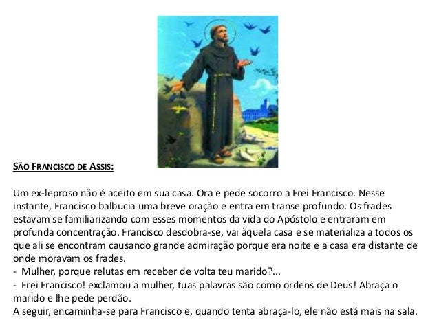 10. 10. SÃO FRANCISCO DE ASSIS: Um ex-leproso não é aceito em sua casa. Ora e pede socorro a Frei Francisco. Nesse instante, Francisco balbucia uma breve oração e entra em transe profundo. Os frades estavam se familiarizando com esses momentos da vida do Apóstolo e entraram em profunda concentração. Francisco desdobra-se, vai àquela casa e se materializa a todos os que ali se encontram causando grande admiração porque era noite e a casa era distante de onde moravam os frades. - Mulher, porque relutas em receber de volta teu marido?... - Frei Francisco! exclamou a mulher, tuas palavras são como ordens de Deus! Abraça o marido e lhe pede perdão. A seguir, encaminha-se para Francisco e, quando tenta abraça-lo, ele não está mais na sala.