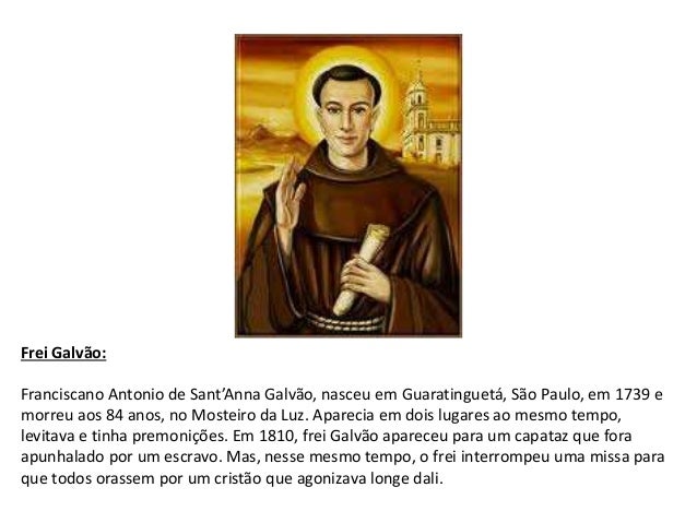 11. 11. Frei Galvão: Franciscano Antonio de Sant’Anna Galvão, nasceu em Guaratinguetá, São Paulo, em 1739 e morreu aos 84 anos, no Mosteiro da Luz. Aparecia em dois lugares ao mesmo tempo, levitava e tinha premonições. Em 1810, frei Galvão apareceu para um capataz que fora apunhalado por um escravo. Mas, nesse mesmo tempo, o frei interrompeu uma missa para que todos orassem por um cristão que agonizava longe dali.