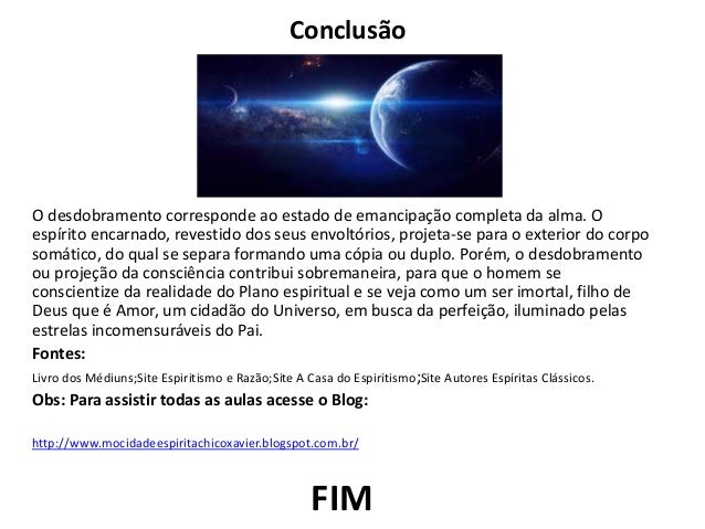 12. 12. Conclusão O desdobramento corresponde ao estado de emancipação completa da alma. O espírito encarnado, revestido dos seus envoltórios, projeta-se para o exterior do corpo somático, do qual se separa formando uma cópia ou duplo. Porém, o desdobramento ou projeção da consciência contribui sobremaneira, para que o homem se conscientize da realidade do Plano espiritual e se veja como um ser imortal, filho de Deus que é Amor, um cidadão do Universo, em busca da perfeição, iluminado pelas estrelas incomensuráveis do Pai. Fontes: Livro dos Médiuns;Site Espiritismo e Razão;Site A Casa do Espiritismo;Site Autores Espíritas Clássicos. Obs: Para assistir todas as aulas acesse o Blog: http://www.mocidadeespiritachicoxavier.blogspot.com.br/ FIM