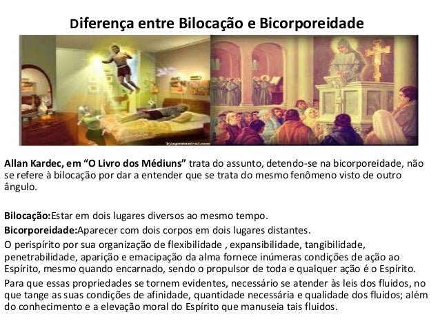 2. 2. Diferença entre Bilocação e Bicorporeidade Allan Kardec, em “O Livro dos Médiuns” trata do assunto, detendo-se na bicorporeidade, não se refere à bilocação por dar a entender que se trata do mesmo fenômeno visto de outro ângulo. Bilocação:Estar em dois lugares diversos ao mesmo tempo. Bicorporeidade:Aparecer com dois corpos em dois lugares distantes. O perispírito por sua organização de flexibilidade , expansibilidade, tangibilidade, penetrabilidade, aparição e emacipação da alma fornece inúmeras condições de ação ao Espírito, mesmo quando encarnado, sendo o propulsor de toda e qualquer ação é o Espírito. Para que essas propriedades se tornem evidentes, necessário se atender às leis dos fluidos, no que tange as suas condições de afinidade, quantidade necessária e qualidade dos fluidos; além do conhecimento e a elevação moral do Espírito que manuseia tais fluidos.