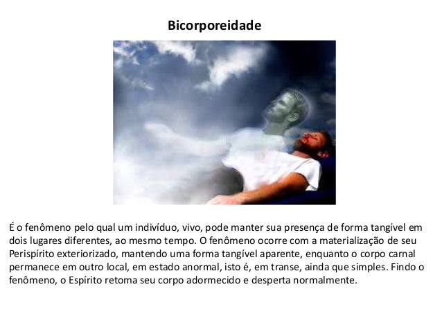 3. 3. Bicorporeidade É o fenômeno pelo qual um indivíduo, vivo, pode manter sua presença de forma tangível em dois lugares diferentes, ao mesmo tempo. O fenômeno ocorre com a materialização de seu Perispírito exteriorizado, mantendo uma forma tangível aparente, enquanto o corpo carnal permanece em outro local, em estado anormal, isto é, em transe, ainda que simples. Findo o fenômeno, o Espírito retoma seu corpo adormecido e desperta normalmente.