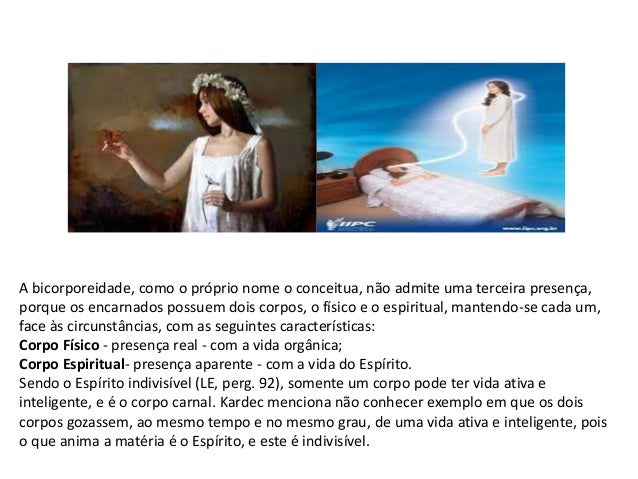 4. 4. A bicorporeidade, como o próprio nome o conceitua, não admite uma terceira presença, porque os encarnados possuem dois corpos, o físico e o espiritual, mantendo-se cada um, face às circunstâncias, com as seguintes características: Corpo Físico - presença real - com a vida orgânica; Corpo Espiritual- presença aparente - com a vida do Espírito. Sendo o Espírito indivisível (LE, perg. 92), somente um corpo pode ter vida ativa e inteligente, e é o corpo carnal. Kardec menciona não conhecer exemplo em que os dois corpos gozassem, ao mesmo tempo e no mesmo grau, de uma vida ativa e inteligente, pois o que anima a matéria é o Espírito, e este é indivisível.