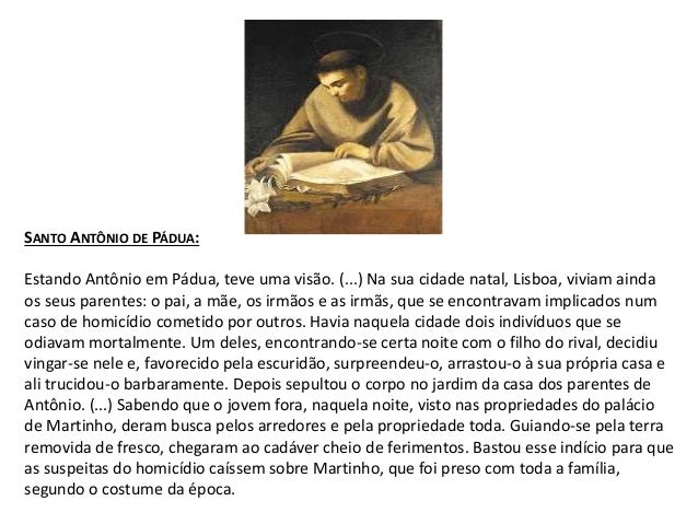 7. 7. SANTO ANTÔNIO DE PÁDUA: Estando Antônio em Pádua, teve uma visão. (...) Na sua cidade natal, Lisboa, viviam ainda os seus parentes: o pai, a mãe, os irmãos e as irmãs, que se encontravam implicados num caso de homicídio cometido por outros. Havia naquela cidade dois indivíduos que se odiavam mortalmente. Um deles, encontrando-se certa noite com o filho do rival, decidiu vingar-se nele e, favorecido pela escuridão, surpreendeu-o, arrastou-o à sua própria casa e ali trucidou-o barbaramente. Depois sepultou o corpo no jardim da casa dos parentes de Antônio. (...) Sabendo que o jovem fora, naquela noite, visto nas propriedades do palácio de Martinho, deram busca pelos arredores e pela propriedade toda. Guiando-se pela terra removida de fresco, chegaram ao cadáver cheio de ferimentos. Bastou esse indício para que as suspeitas do homicídio caíssem sobre Martinho, que foi preso com toda a família, segundo o costume da época.