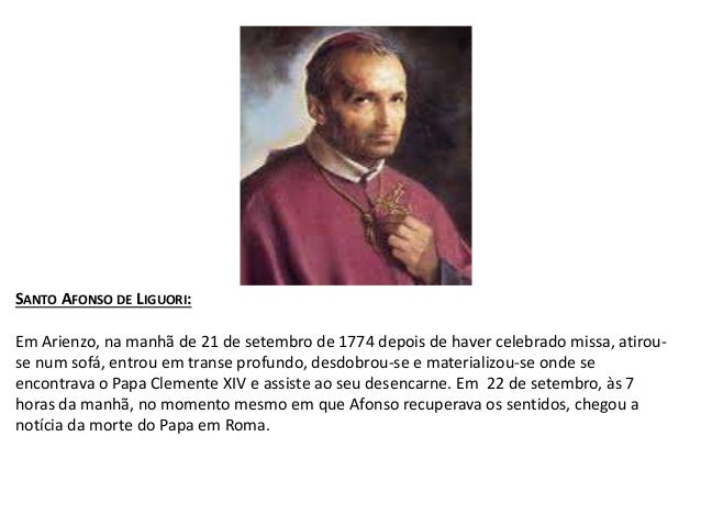 9. 9. SANTO AFONSO DE LIGUORI: Em Arienzo, na manhã de 21 de setembro de 1774 depois de haver celebrado missa, atirou- se num sofá, entrou em transe profundo, desdobrou-se e materializou-se onde se encontrava o Papa Clemente XIV e assiste ao seu desencarne. Em 22 de setembro, às 7 horas da manhã, no momento mesmo em que Afonso recuperava os sentidos, chegou a notícia da morte do Papa em Roma.