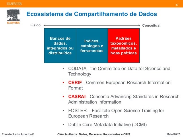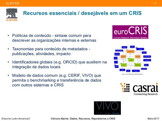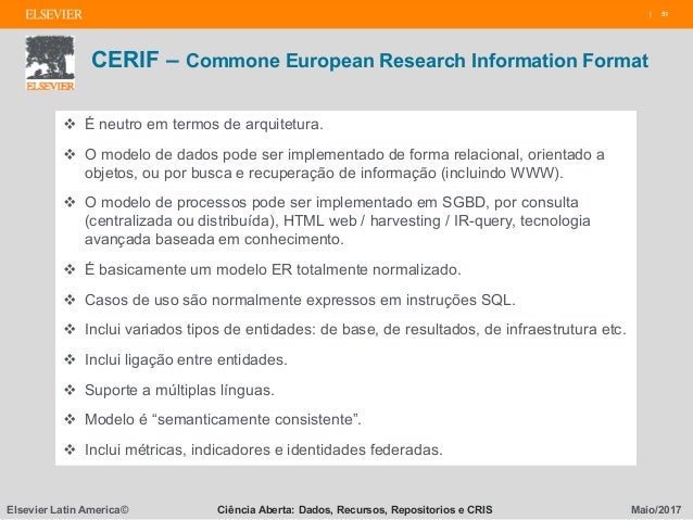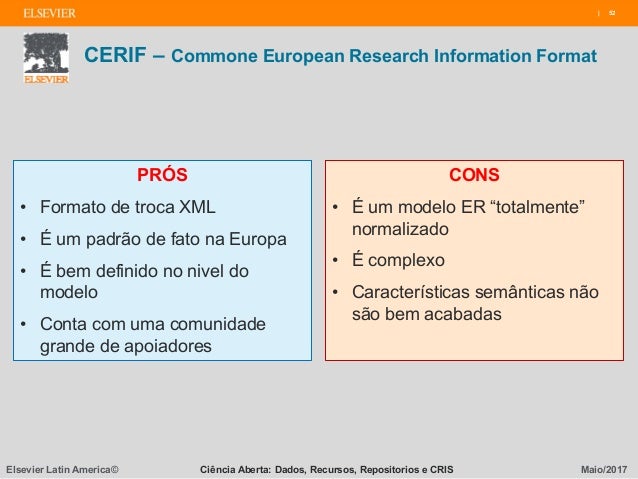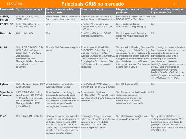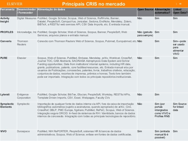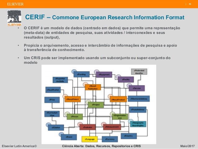 Os sistemas CRIS utilizam o padrão CERIF (Common European Research Information Format), proposto pela Comunidade Européia, desenvolvido e mantido pelo euroCRIS. Entre os exemplos de soluções comerciais e universitárias CRIS, incluindo o tratamento de contratos, projetos, publicações, planos de estudo e patentes disponíveis estão o Pure (Elsevier), Converis (Thomson Reuters/Clarivate), DSpace-CRIS.
