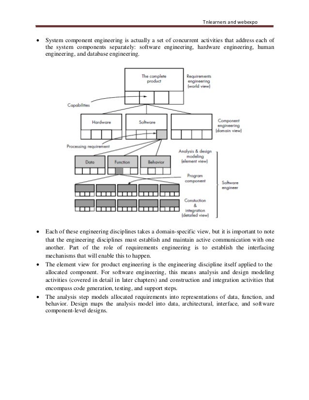 10. 10. Tnlearners and webexpo • System component engineering is actually a set of concurrent activities that address each of the system components separately: software engineering, hardware engineering, human engineering, and database engineering. • Each of these engineering disciplines takes a domain-specific view, but it is important to note that the engineering disciplines must establish and maintain active communication with one another. Part of the role of requirements engineering is to establish the interfacing mechanisms that will enable this to happen. • The element view for product engineering is the engineering discipline itself applied to the allocated component. For software engineering, this means analysis and design modeling activities (covered in detail in later chapters) and construction and integration activities that encompass code generation, testing, and support steps. • The analysis step models allocated requirements into representations of data, function, and behavior. Design maps the analysis model into data, architectural, interface, and software component-level designs.