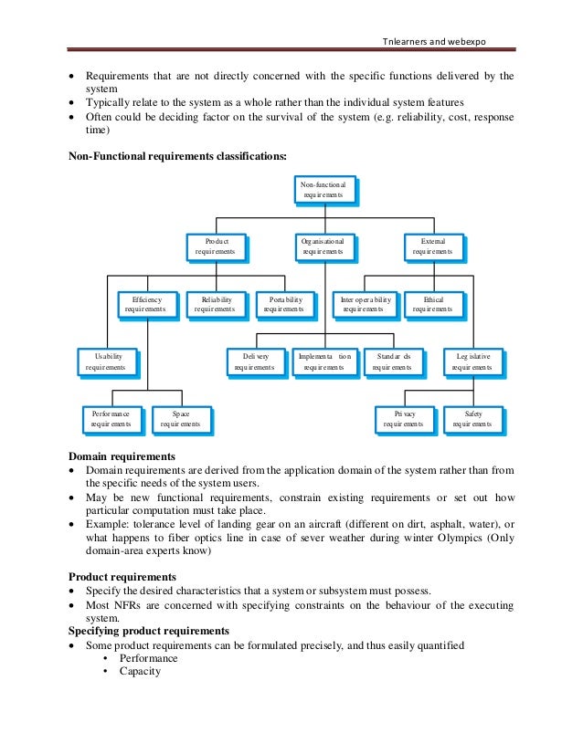 12. 12. Tnlearners and webexpo • Requirements that are not directly concerned with the specific functions delivered by the system • Typically relate to the system as a whole rather than the individual system features • Often could be deciding factor on the survival of the system (e.g. reliability, cost, response time) Non-Functional requirements classifications: Non-functional requir ements Product requir ements Organisational requir ements External requir ements Efficiency requir ements Reliability requir ements Portability requir ements Inter oper ability requir ements Ethical requir ements Usability requir ements Deli very requir ements Implementa tion requir ements Standar ds requir ements Leg islative requir ements Performance requir ements Space requir ements Pri vacy requir ements Safety requir ements Domain requirements • Domain requirements are derived from the application domain of the system rather than from the specific needs of the system users. • May be new functional requirements, constrain existing requirements or set out how particular computation must take place. • Example: tolerance level of landing gear on an aircraft (different on dirt, asphalt, water), or what happens to fiber optics line in case of sever weather during winter Olympics (Only domain-area experts know) Product requirements • Specify the desired characteristics that a system or subsystem must possess. • Most NFRs are concerned with specifying constraints on the behaviour of the executing system. Specifying product requirements • Some product requirements can be formulated precisely, and thus easily quantified • Performance • Capacity